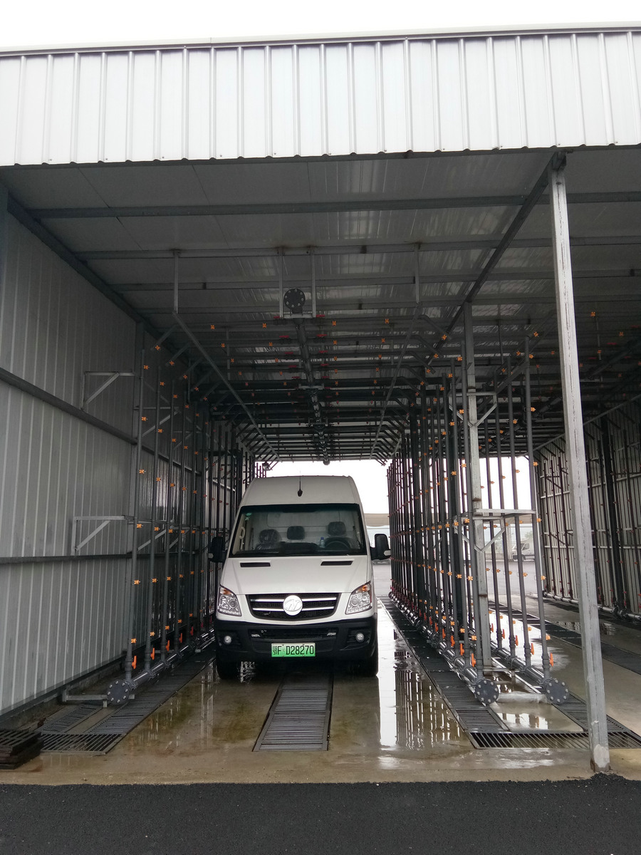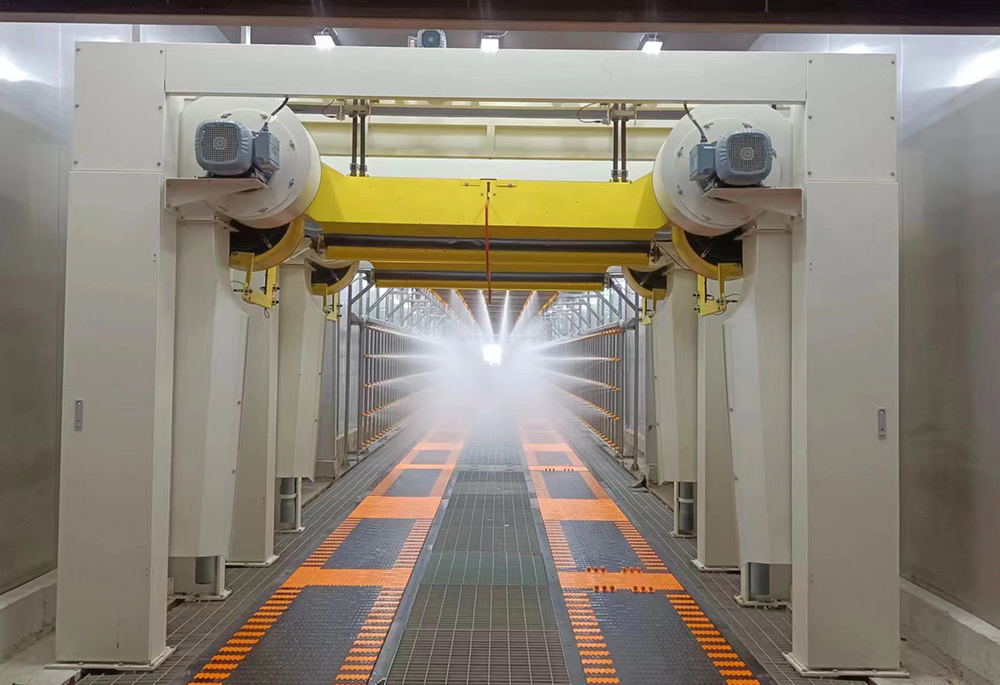 淋雨系統(tǒng)由室體、噴淋系統(tǒng)、鋼結(jié)構(gòu)骨架、地坑蓋板、地坑照明及電氣控制系統(tǒng)等組成。淋雨強(qiáng)度可達(dá)中高等強(qiáng)度≧25L(min*㎡),淋雨時間≧15分鐘,水泵可采用變頻可調(diào),淋雨方式(手)自動全噴淋。